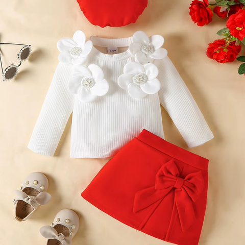 2025 otoño niños ropa de manga larga 3D flor superior arco falda sombrero 3 uds conjunto