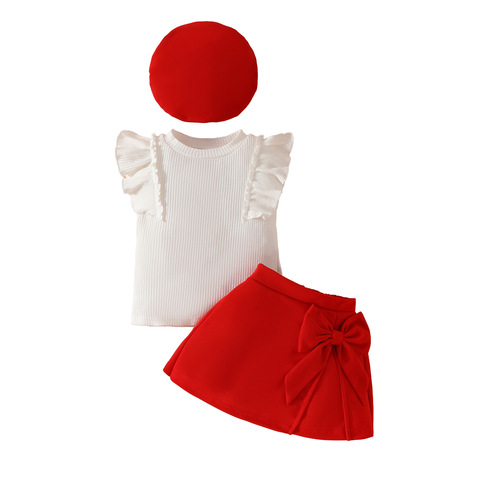 Conjunto de ropa de verano 2025 para niñas, camisa blanca pura de estilo informal + falda con lazo + sombrero, venta al por mayor a buen precio