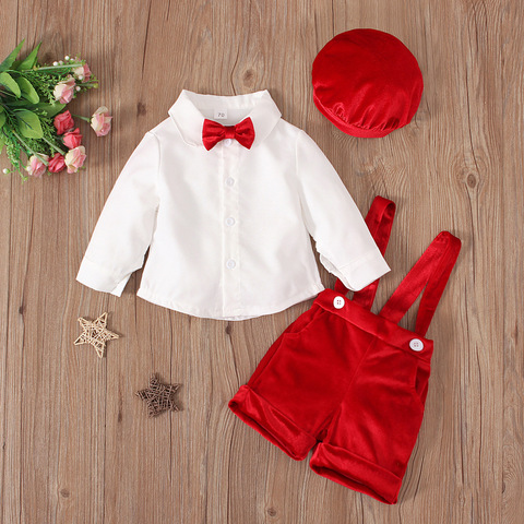 Conjunto de camisa de manga larga para bebé infantil con lazo + Pantalones cortos con tirantes + sombrero traje de caballero